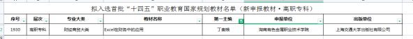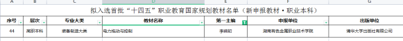 5月8日,从教育部职业教育与成人教育司发布的《关于拟入选首批“十四五”职业教育国家规划教材名单的公示》获悉,我院丁贵娥老师主编的《EXCEL在财务中的应用》、李响初老师主编的《电力拖动与控制》2本教材成功入选“十四五”职业教育国家规划教材,实现了我院国家规划教材零突破。这是我校深入贯彻落实党中央、国务院关于教材建设的决策部署和《国家职业教育改革实施方案》相关要求的重要成果,也是我校“双高”建设标志性成果的重大突破。